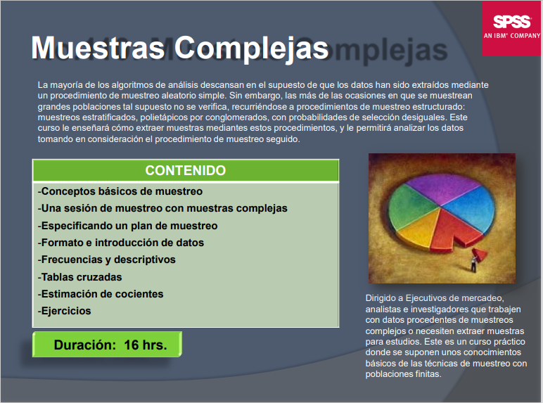 analistas e investigadores que trabajen con datos procedentes de muestreos complejos o necesiten extraer muestras para estudios. Este es un curso práctico donde se suponen unos conocimientos básicos de las técnicas de muestreo con poblaciones finitas